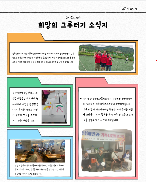 2025년 희망의 그루터기 3분기 소식지 페이지 정보 작성자최고관리자 조회 2,410회 작성일 2025-09-29 14:28:05 댓글 0 본문 2025년 희망의 그루터기 3분기 소식지 이전글 2025년 희망의 그루터기 4분기 소식지 다음글2025년 희망의 그루터기 2분기 소식지 목록 댓글목록 등록된 댓글이 없습니다.