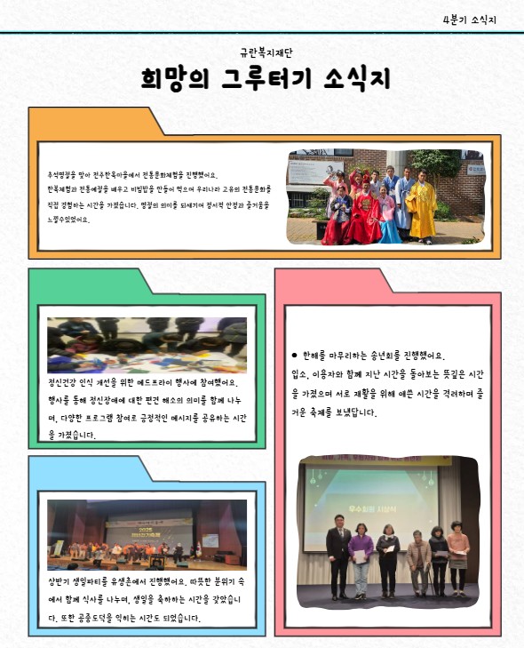 2025년 희망의 그루터기 4분기 소식지 페이지 정보 작성자최고관리자 조회 1,385회 작성일 2025-12-28 14:28:30 댓글 0 본문 2025년 희망의 그루터기 4분기 소식지 다음글2025년 희망의 그루터기 3분기 소식지 목록 댓글목록 등록된 댓글이 없습니다.