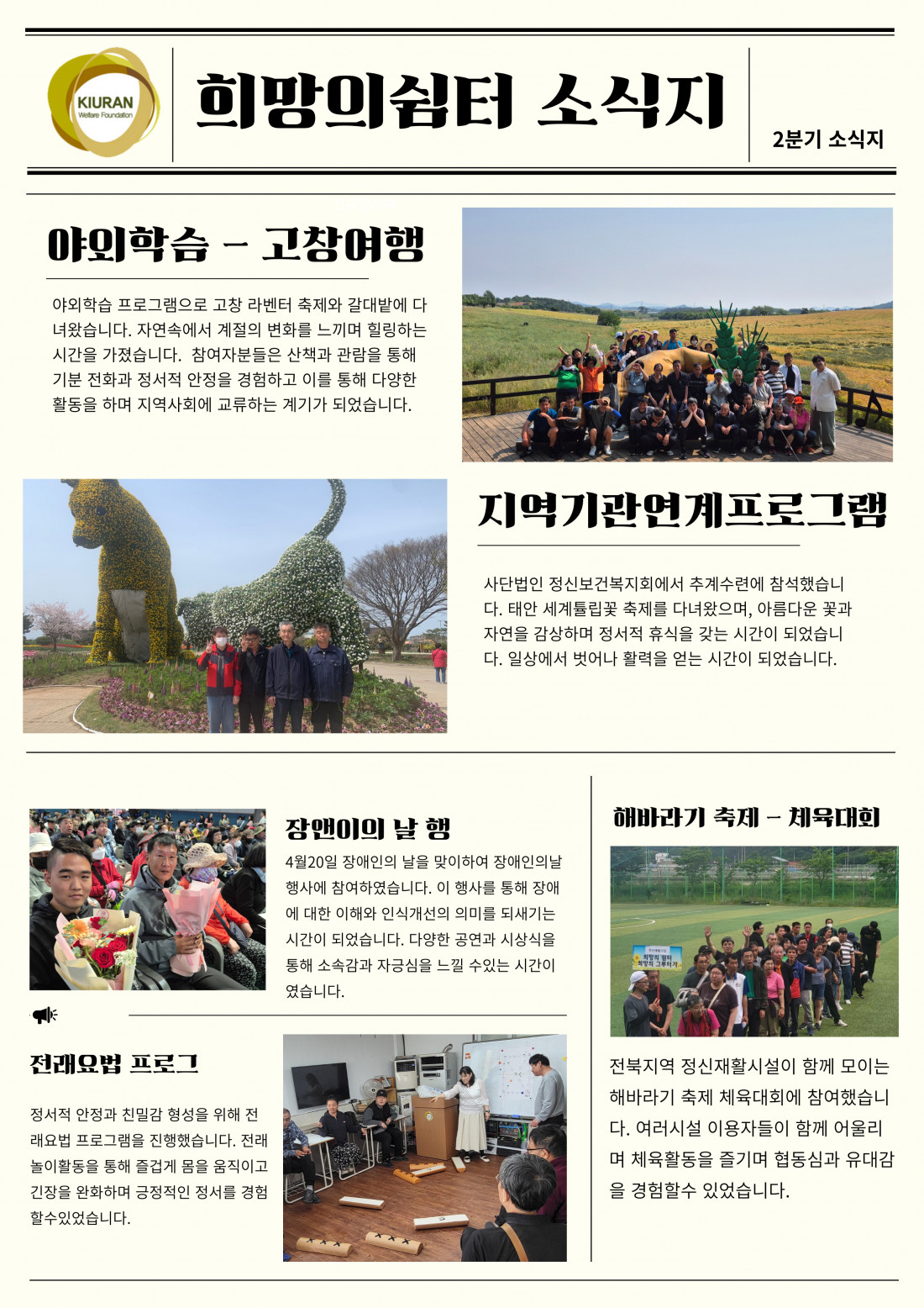 2025년 희망의쉼터 2분기 소식지 페이지 정보 작성자최고관리자 조회 2,847회 작성일 2025-06-29 10:39:37 댓글 0 본문 2025년 희망의쉼터 2분기 소식지 이전글 2025년 희망의쉼터 3분기 소식지 다음글2025년 희망의쉼터 1분기 소식지 목록 댓글목록 등록된 댓글이 없습니다.